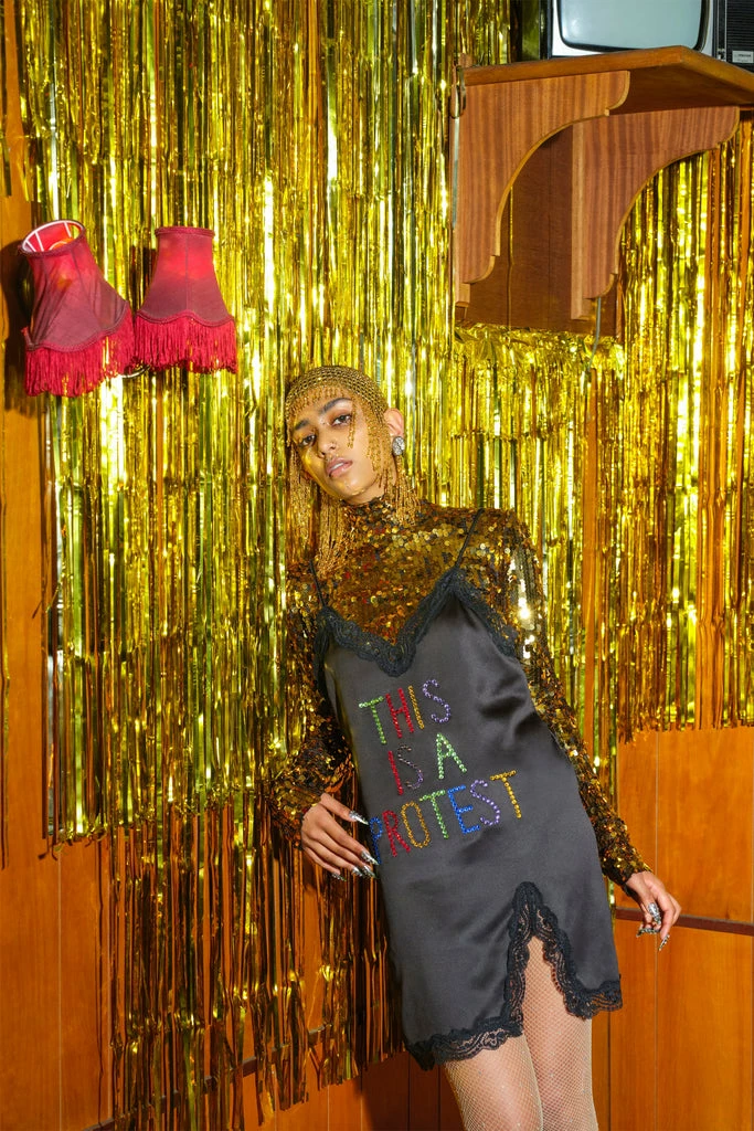 Designed by the celebrity-favorite couture visionary Ashish and brought to life with Bluebellaβs spirited direction, our latest limited-edition collaboration is the best way to express your individuality through unapologetic sparkle and unique silhouettes. If youβre looking to make a bold statement with your fashion choices, this stylish chemise is guaranteed to deliver that and more. Crafted in luxurious satin and trimmed with intricate lace that creates a timelessly elegant finish, the flattering piece spotlights a This Is A Protest slogan realized with Ashishβs signature diamantes. Presented with an exclusive Bluebella x Ashish garment bag.