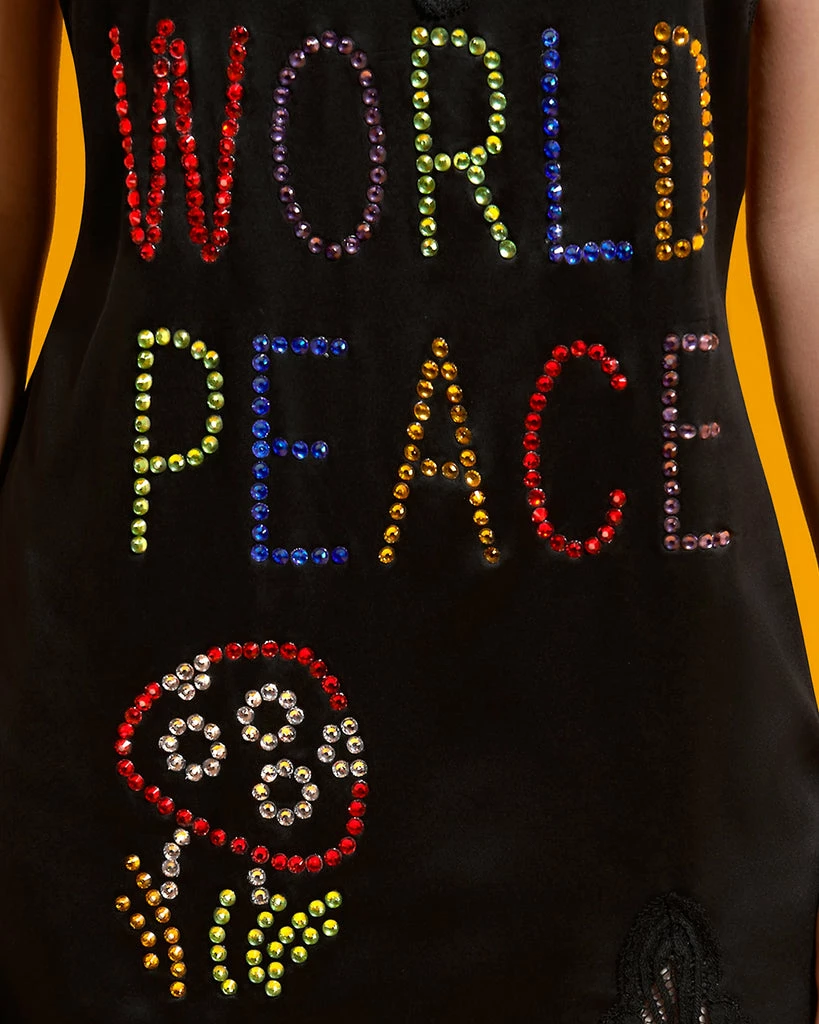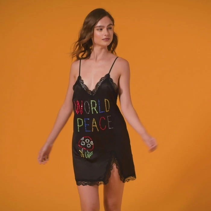 Designed by the celebrity-favorite couture visionary Ashish and brought to life with Bluebellaβs spirited direction, our latest limited-edition collaboration is the best way to express your individuality through unapologetic sparkle and unique silhouettes. If youβre looking to make a bold statement with your fashion choices, this stylish chemise is guaranteed to deliver that and more. Crafted in luxurious satin and trimmed with intricate lace that creates a timelessly elegant finish, the flattering piece spotlights a World Peace slogan along with a playful mushroom motif β created with Ashishβs signature diamantes.Β Presented with an exclusive Bluebella x Ashish garment bag
