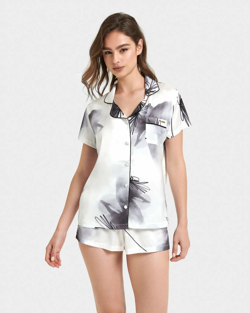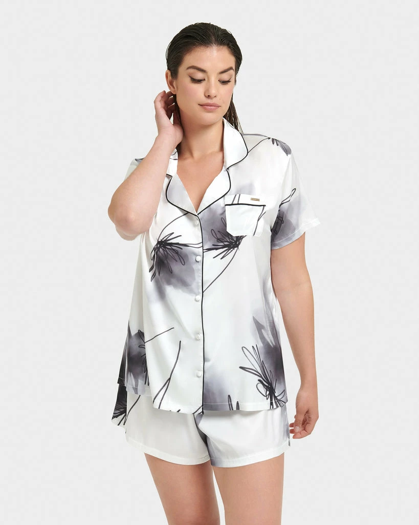 Bring a luxurious mood to your loungewear edit with the ethereal Camille shirt and short set. This delicate, satin duo features an abstract print and a flowing silhouette, lending a distinctively seductive note to those moments of relaxation. Slip it over your favourite lingerie or wear solo to fully unleash its provocative undertones.