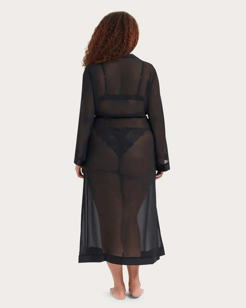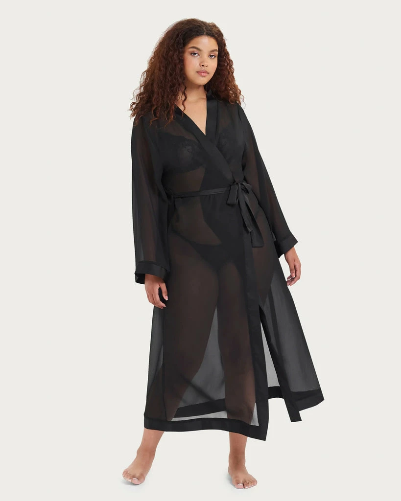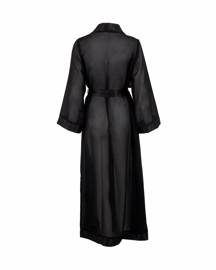 This full length luxurious chiffon kimono is a must-have item to complete your lingerie and nightwear wardrobe.ย ย Soft sheer chiffon, edged with a deep satin trim around the leading edge and and cuffs. Luxurious satin waist tie.