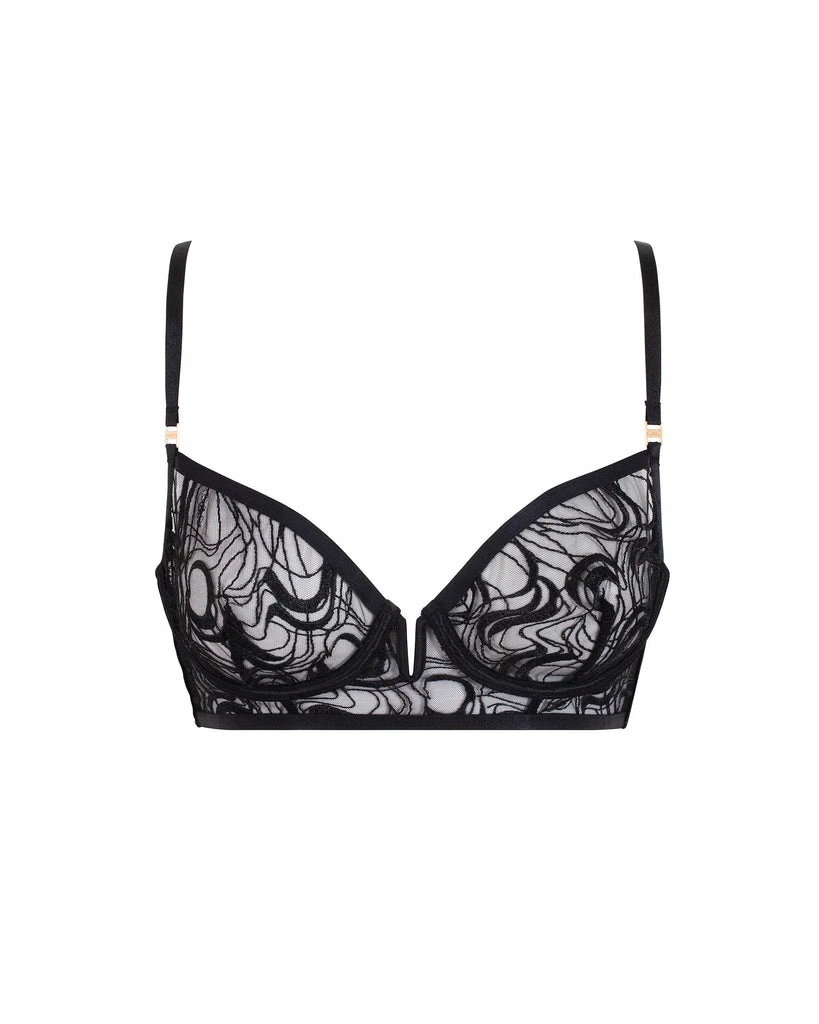 Catching the eye with its unique, abstract embroidery, the Meara bra blurs the line between fashion and art. Fitted with a supportive wire to create a beautiful shape and provide comfort, this bold style uses multiple straps to frame your silhouette in a fashion-forward way. Depending on the desired final look, style this stunner of a bra with either the panty or the high-waist thong from the Meara collection.