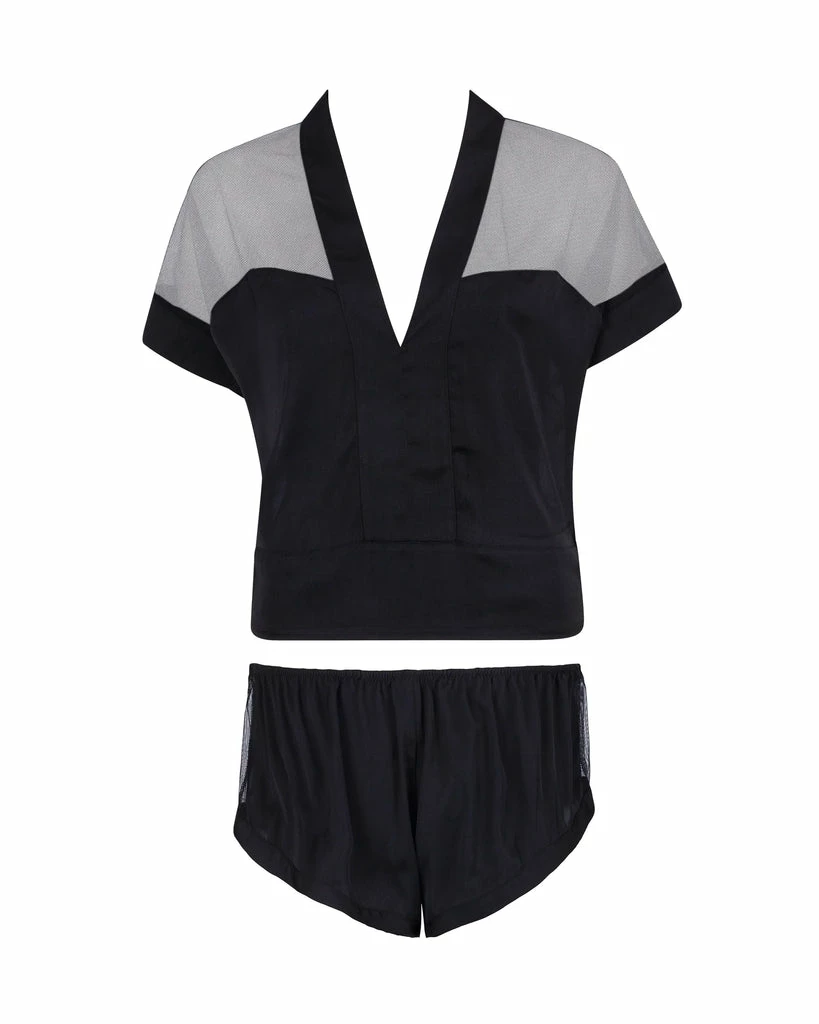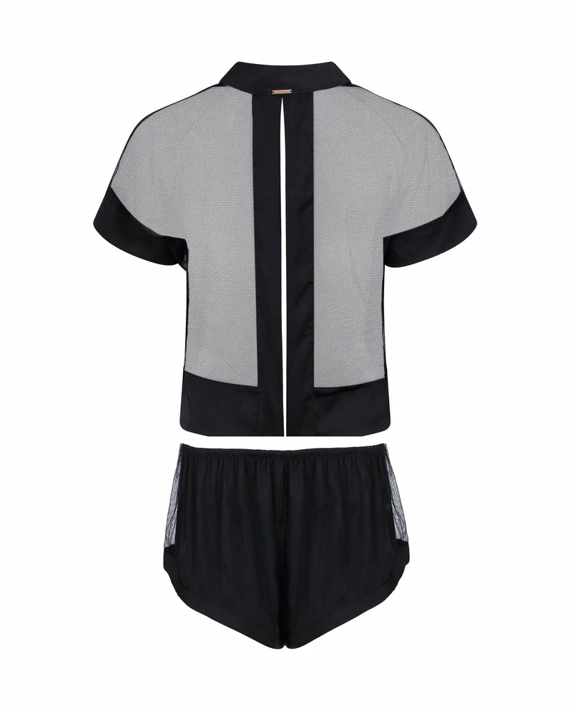 The Richmond set introduces a fashion-forward twist on traditional pyjamas. Playing with panels of soft jersey and delicate mesh, this elegant, short duo grabs the attention with a daring split to the reverse of the top. Enjoy it on relaxing evenings, peaceful nights or lazy weekends.