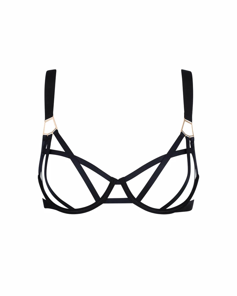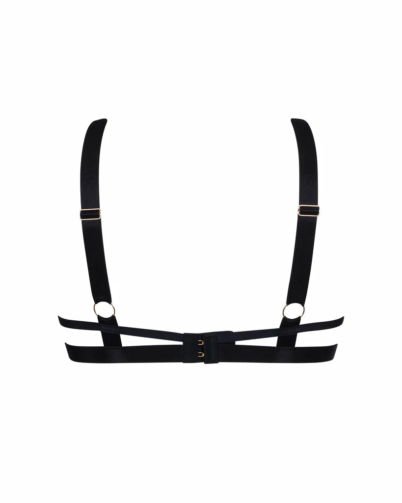 Proving that you can achieve striking results with minimal coverage, the boldly provocative Salma bra frames your body for a distinctively daring look. The slimline bands are connected to wider shoulder straps with chunky gold-tone hardware for a perfectly balanced finish. If you’re looking for a set that embodies the idea of stylish provocation, style this unique bra with the Salma thong or Ouvert panty.