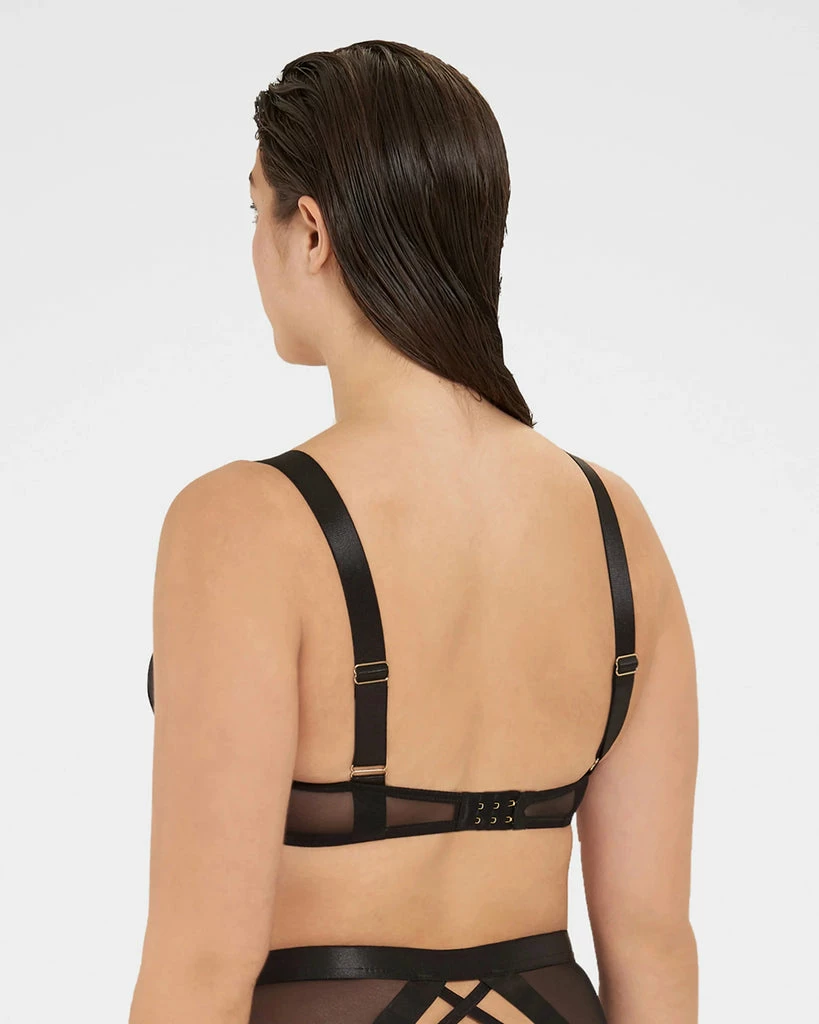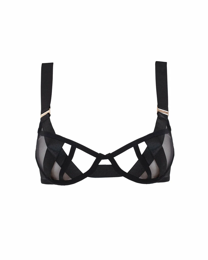 Elegant and contemporary, the Sawyer Bra works with superfine mesh and directional banding to create an unforgettable lingerie look. Elasticated strapping creates provocative cut outs whilst geometric gold tone hardware brings an industrial glamour. Fully adjustable shoulder straps ensure the perfect fit. Wear with other items from the Sawyer collection for a bold and modern look.ย