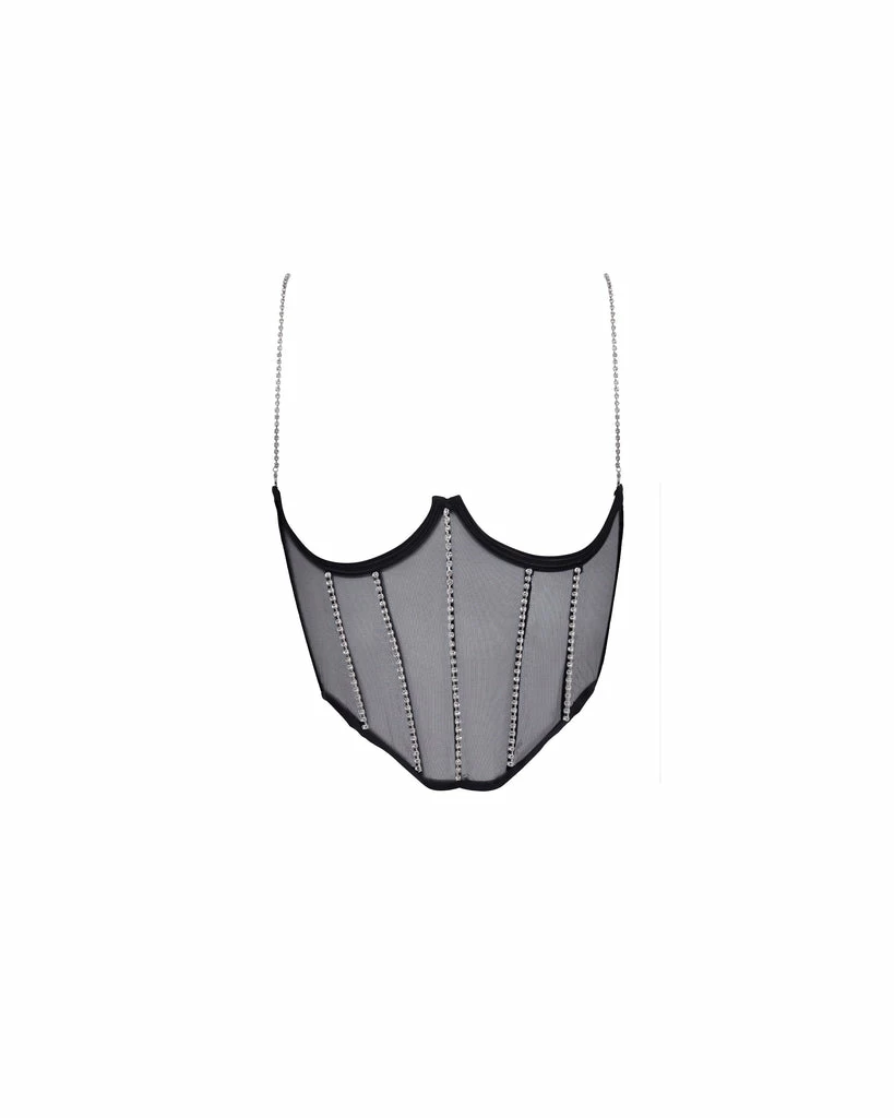 Blurring the line between art and fashion, the showstopping Zenn bustier will steal the hearts of fashion-forward lingerie lovers with its unique design and flattering silhouette. Enlivened with a touch of stylish sparkle courtesy of the shimmering diamantes to the straps and bodice, this daringly ouvert bustier inspires styling possibilities for seasons to come. Embrace the dazzling credentials of this piece and style it with the matching Zenn nipple pasties and thong.